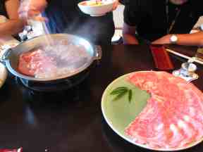 We started with smooth thick sesame tofu, steamed root vegetables, and cool squid salad, and continued on to a delicious sashimi plate in our set lunch. Then onto a clear stew with mushrooms, beans, carrot, and daikon, which was hearty and satisfying. But of course it was the unforgettable main event that we had come for: the meat for the sukiyaki/gyunabe was marblelized and set out in large, thinly sliced pieces. Unlike some lower market joints, two waitresses in kimono arrived to cook the sukiyaki for each end of our table. The sauce was very shallow in the pan, they always seemed to know when to add more, exactly when to turn the meat over, and just how long each vegetable needed to be cooked.